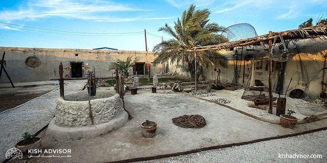 خونه مردمشناسی بومیان کیش 1200 متر مساحت و 15 اتاق داره و در ساختش از سنگهای مرجانی، گل، ساروج، دَعن (شاخه نخل)، چندل، منگور (نوعی حصیر) و یدع (تنه نخل) استفاده شده. همینطور دارای دو حیاط مجلسی (بیرونی) و اندرونی هست که بخشهای عمومی در حیاط مجلسی و بخشهای خصوصی در حیاط اندرونی ایجاد شدند. حیاط مجلسی هم دارای یک درِ اختصاصی هست و از بخشهایی مثل اتاق تابستانه، اتاق زمستانه، انبار خرما (چَندول)، انبار ابزار صید و شناورها و یک حلقه چاه تشکیل شده. برخلاف حیاط بیرونی، حیاط اندرونی مخصوص خونواده بوده و دور از چشم مردان غریبه و نامحرم قرار داشته. اتاق خوابهای زمستانه و تابستانه، مطبخ، مکتبخونه، اتاق میهمانی زنان، انبار خرما، انبار علوفه و آغل و یک حلقه چاه نیز در این حیاط قرار دارند. اندرونی هم دارای یک در اختصاصی برای رفتوآمد افراد خونواده است.